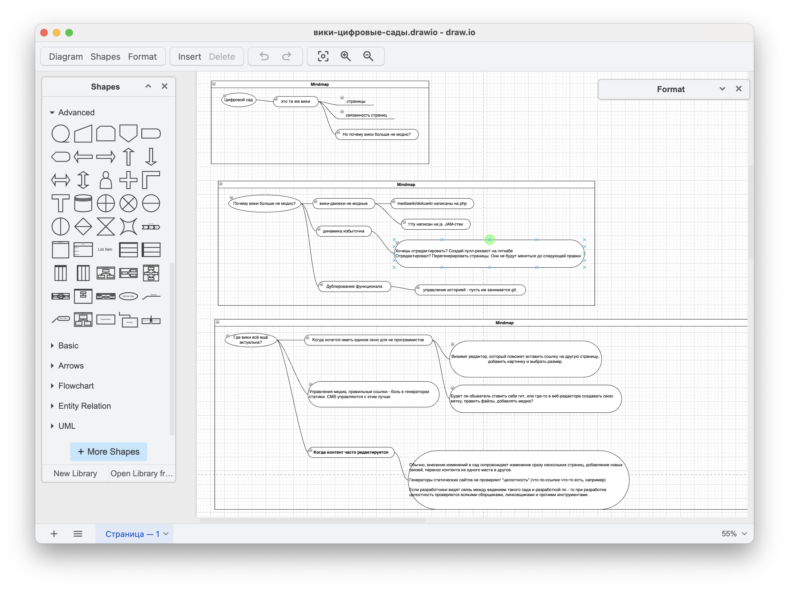 Майндмапы в Drawio - это просто совокупность нескольких умных фигур. Но их удобно накидывать, перемещать, скреплять связями.
